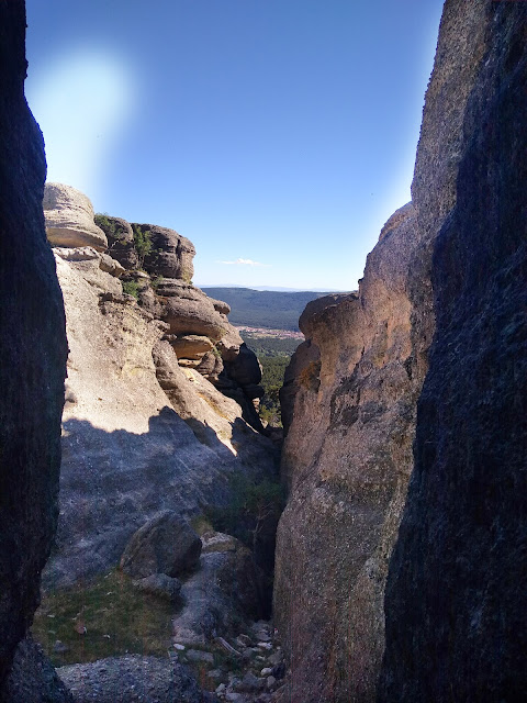 que nos lleva a la pista anterior y volvemos a realizar el mismo tramo en ascenso, dejamos ahora el desvío a la derecha y continuamos de frente hasta el cruce de la horca, para hacer izquierda , ya en fuerte ascenso por pista acondicionada hasta que desaparece la pista y comienza un sendero que nos deja en una zona con parajes agrestes en los que la erosión de los milenios provocada por el agua, el hielo y el viento